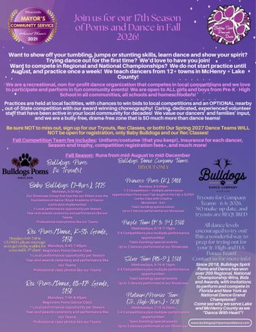 Bulldogs Spirit Poms and Dance is a 501(c)(3) non-profit serving the community and is not affiliated with any school district, dance institution, park district, youth sports league, one town or township. Serving the Port Barrington, barrington, Wauconda, Island Lake, McHenry, Volo, Lakemoor, Lake Barrington, Crystal Lake, Cary, round lake, lake zurich, MUNDELEIN, and surrounding areas. Open to all public, private and homeschooled girls and boys in the area.